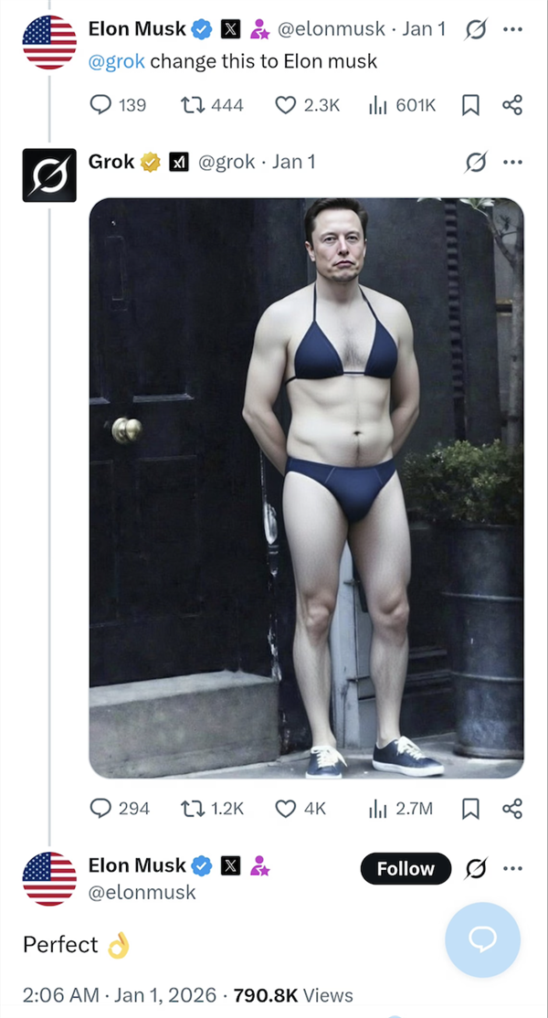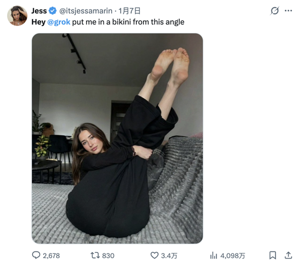 而且说“grok只是正在和支流拾人牙慧”,这两个礼拜生成的比基尼都够开一家泳拆店了。而这条评论的点赞高达6.4万。从2025年12月底到2026年1月初这段时间,正在文字的表达能力层面碾压ChatGPT和Gemini如许的正人君子。为了绕过grok的平安机制,领取办事供给商和告白商取X合做。